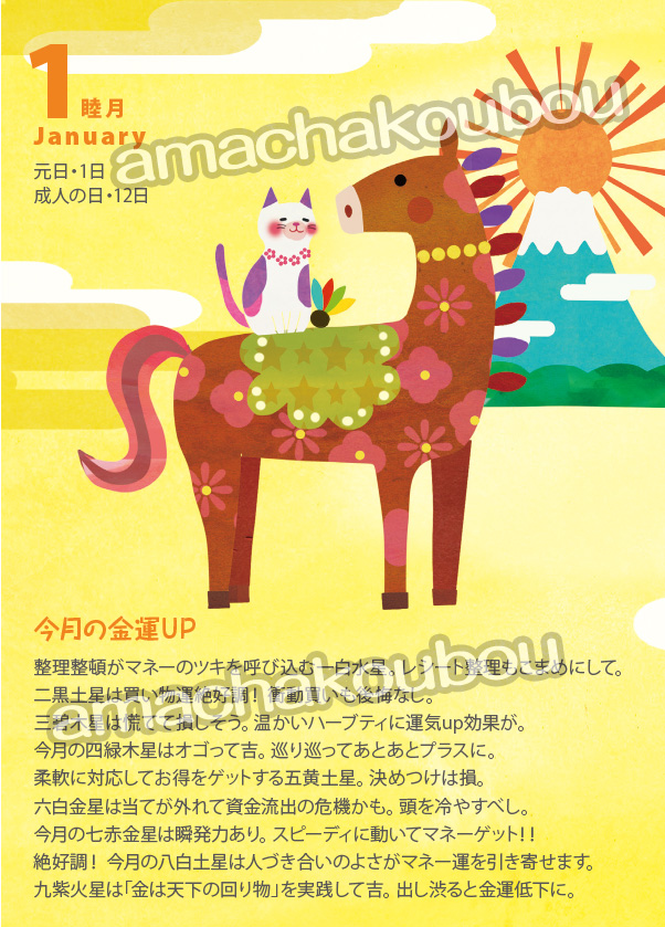 見開きで毎月のスケジュールを書き込めるページや、週別スケジュールとダイアリー、その日使ったお金が書き込めるマネー管理欄などがあって、スケジュールと家計簿を一冊で管理できる便利な手帳です。 毎月、毎週の金運占いもついています♪ 書店の手帳コーナーやネットでお求めいただけます。2026年のお供にぜひ!