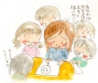 その小学校のクラブ活動の中にイラストクラブなるものがあり、そのクラブ生たちにイラストを教えにいったというわけです。4~6年生が8人、こじんまりとした人数でみんなと話すにはちょうどいい感じでした。最初はおたがいコチコチでしたが、なれてくると「かわいい女の子描いて」とか「体のバランス教えて」とか、色々出てきてあっという間に時間がたってしまいました。みんな絵は上手だし、素直でかわいかったです。楽しい経験をさせていただきました。約束したポストカードは送りましたからね~。