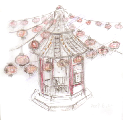 窓下にある中国風の東屋に向かって、たくさんのランタンが