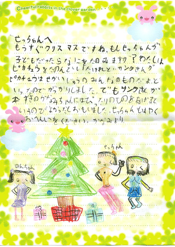 姪っ子よりおばちゃんへ 1 2005年12月22日 から amachakoubou | 0件のコメント 姪っ子(6歳)からの手紙です。 手紙をクリックすると拡大できます。 共有: クリックして X で共有 (新しいウィンドウで開きます) X Facebook で共有するにはクリックしてください (新しいウィンドウで開きます) Facebook 関連
